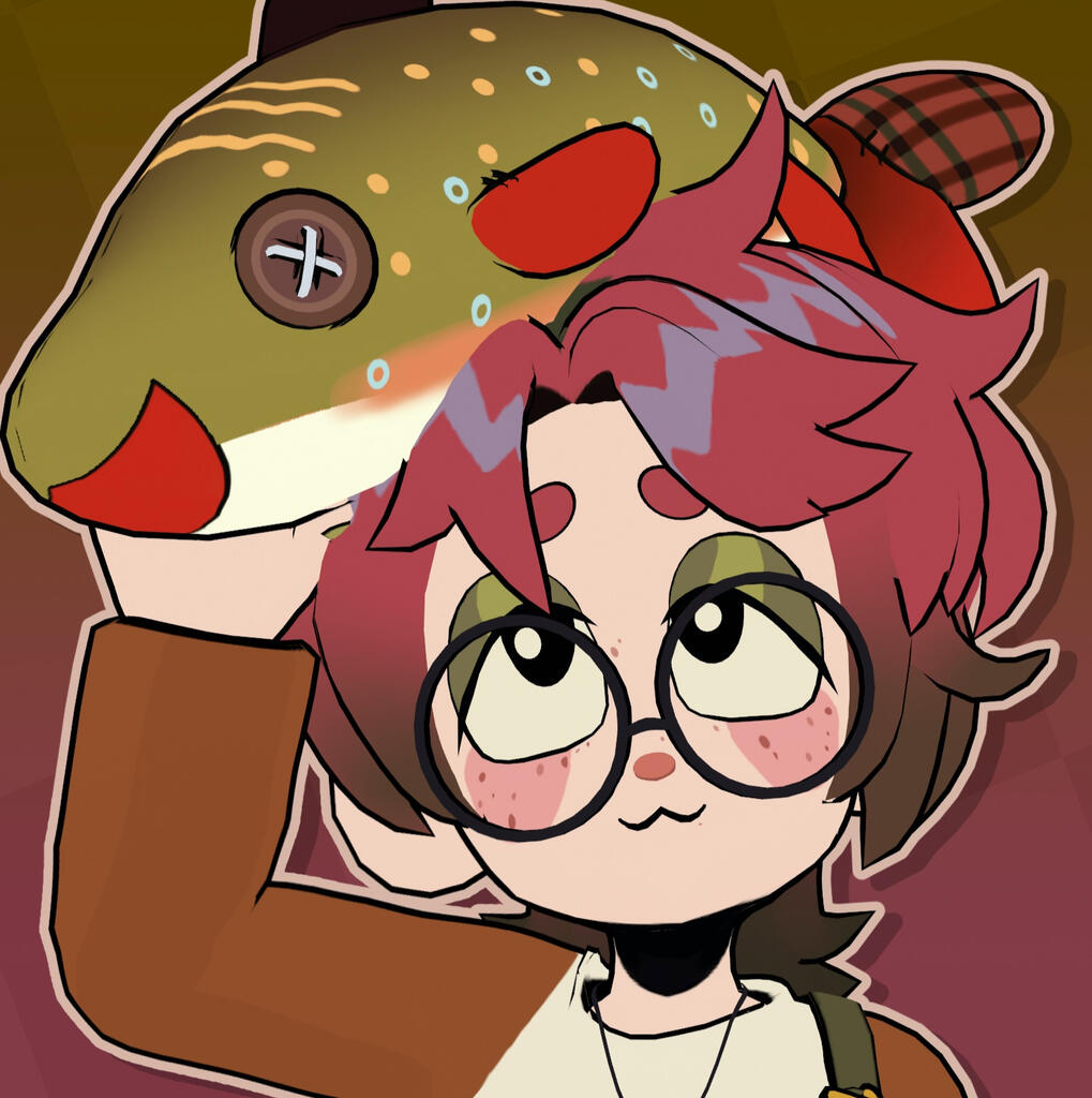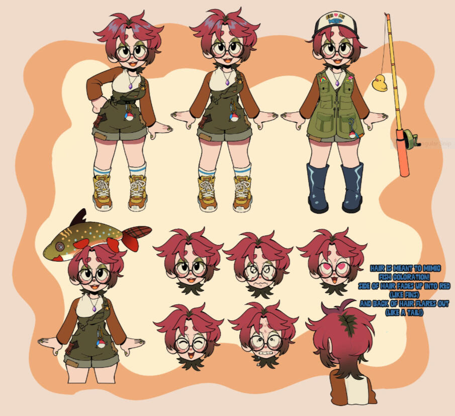 Jewel is a biologist and fisherperson who loves all her fishy friends! She lives at an old abandoned river dam deep within a beautiful coastal redwood forest. The dam was initially built to supply power to the nearby village where Jewel was born and raised. Since then, the town has moved to sustainable energy and left the dam abandoned for years. Jewel’s father ran the hydroelectric dam and taught her the ins and outs of the fishway. A fishway is a method for fish to swim over a dam when moving upstream to spawn. It is formed like a ladder, where instead of one large waterfall (which is nearly impossible for fish to climb), a fishway has multiple levels of small pools that fish can use and take breaks in as they make their trek upstream, like a water staircase! The types of fish that usually utilize this structure are diadromous. Diadromous fish are typically born in freshwater but live much of their life in saltwater, meaning they make annual treks from freshwater to saltwater and vice versa to spawn. When Jewel’s father passed away, she became the sole caretaker of the dam and its fishway. Her daily tasks are to clean out debris from the ladder, count fish and identify them as they pass by, and educate others on fisheries conservation.Jewel’s favorite fish, who loves to stop by and say hello to her in her fishway window, is Blub the brook trout! Blub is not a sea-run brook trout, so he is not diadromous, but he still loves to use the fishway to say hello to his best pal on his swim upstream and downstream! Jewel loves Blub so much that she wears a plushie of him on her head as a hat.When Jewel is not counting fish or cleaning the fishway, she likes to raise money for her cause by streaming on Twitch! Her goal is to educate others on diadromous fish and teach about the effects of human disturbances on the environment (i.e., building dams). Her long-term goal is to raise enough money to destroy old dams and work to rehabilitate watershed ecosystems, helping to reunite fish communities! She plans to do charity streams in the future to donate to nonprofits that are working towards this goal. She also wishes to create better access for people of all communities, especially those marginalized, to fly fish and to feel welcomed and comfortable in the fishing community!